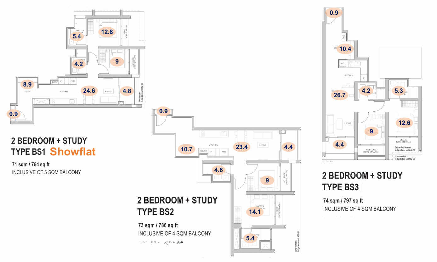 2 Bedroom + Study (764–797 sqft) - 120 units